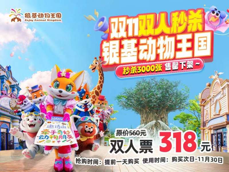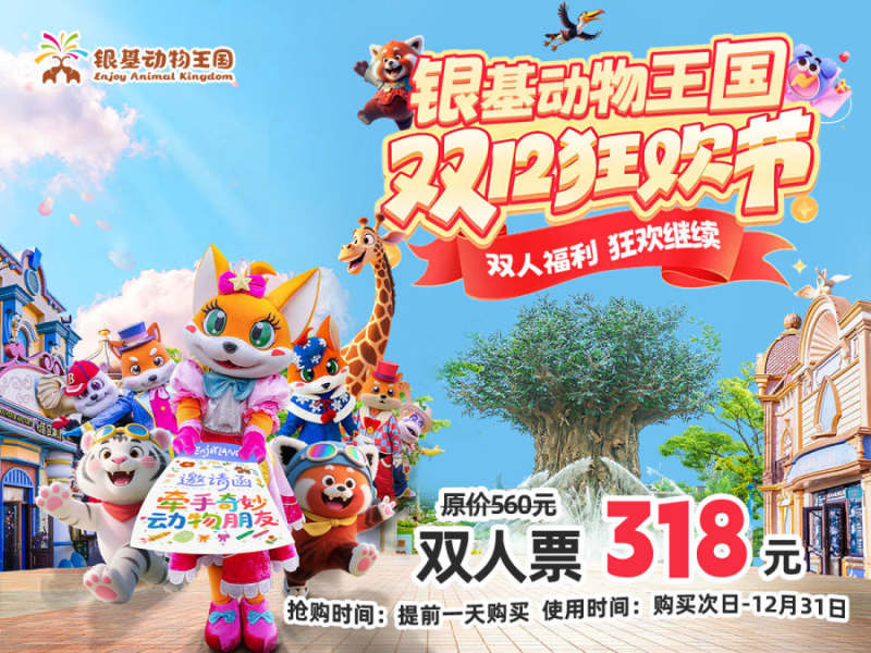 【限时抢购•双12特惠双人票】银基动物王国双人票!提前一天购买,刷身份证入园~限时抢购,售卖至12.25号(有效期:游玩日至12月31日)